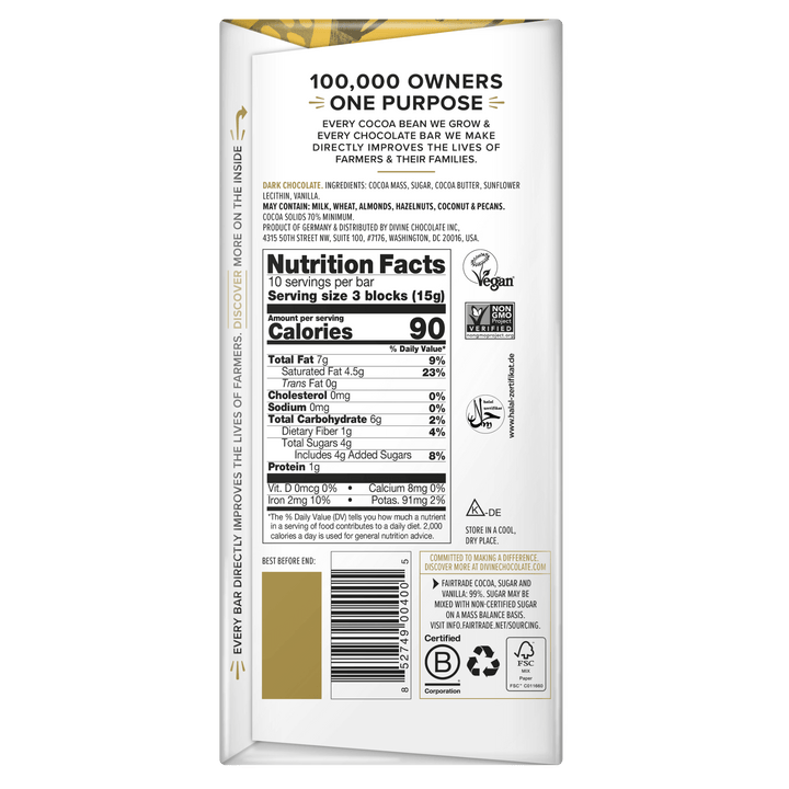 Unlock the rich, luxurious flavor of our 70% Bittersweet Baking Bar—ideal for crafting indulgent desserts or enjoying on its own. Made from the finest ingredients, this critically acclaimed dark chocolate offers a perfect balance of intense cocoa mass and smooth cocoa butter, delivering a deep, satisfying taste. A hint of vanilla rounds out the flavor, making this bar a must-have for bakers and chocolate lovers seeking a rich, smooth finish to their creations.